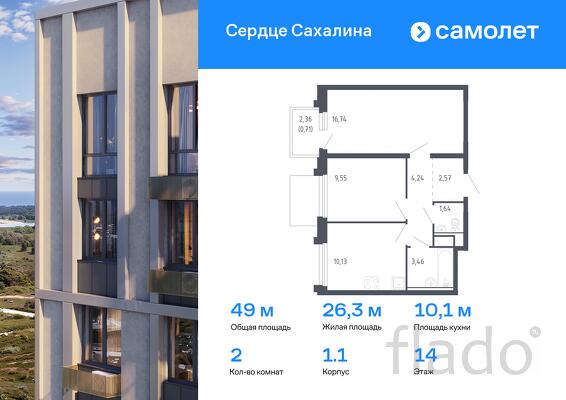 Предлагается 2-комнатная квартира комфорт-класса 49,04 кв.м в корпусе 1.1 на 14 этаже, в ЖК «Сердце Сахалина»