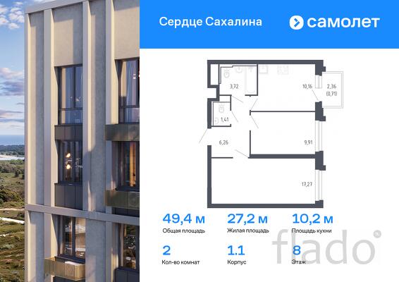 Предлагается 2-комнатная квартира комфорт-класса 49,44 кв.м в корпусе 1.1 на 8 этаже, в ЖК «Сердце Сахалина»